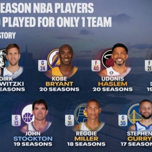 一人一城17+赛季名单:诺维茨基 独行侠 21个赛季科比 湖人 20个赛季哈斯勒姆 热火 20个赛季邓肯 马刺 19个赛...