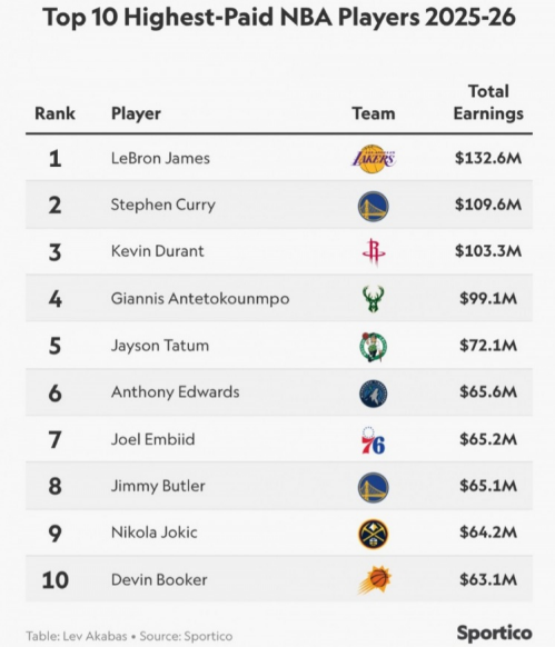 北京时间2月21日,美媒Sportico公布2025-26赛季NBA总收入(NBA年薪+场外代言收入)最高前十球员榜单,詹姆斯以1.326亿美元高居榜首,库里与杜兰特分列二三位,他们也是仅有的3位超过1亿美元收入球员。