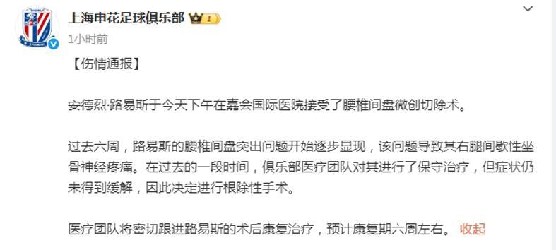 中超第24轮,上海申花将主场迎战山东泰山,申花目标肯定是3分,泰山队没有成绩压力。申花要赢球,就得有攻击手啊! 9月8日下午,上海申花足球俱乐部发布公告,外援安德烈-路易斯接受了腰椎间盘微创切除术,医疗团队将密切跟进路易斯的术后康复治疗,预计康复期六周左右。